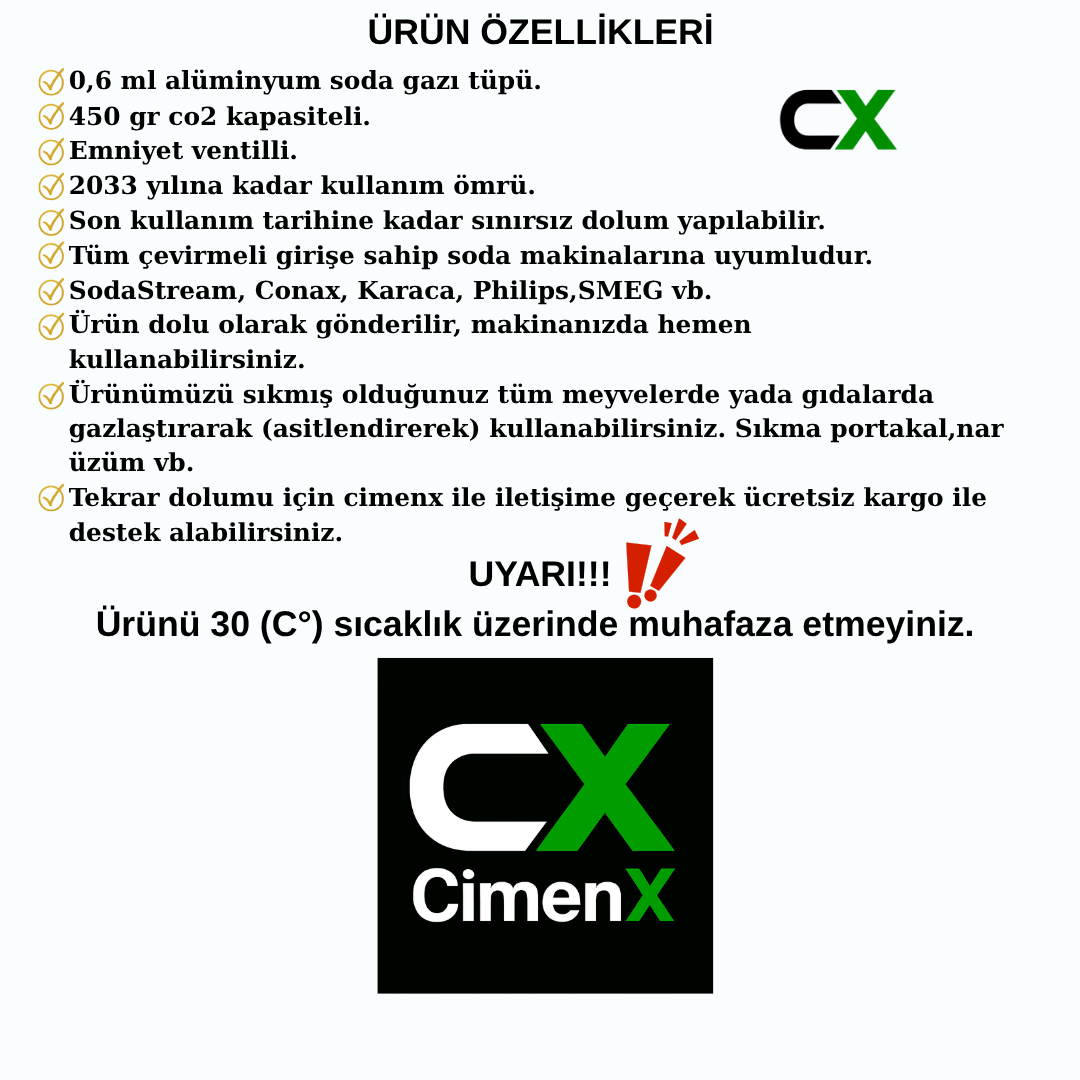 - SodaStream, Conax, Karaca vb firmaların soda makinelerine uyumludur.